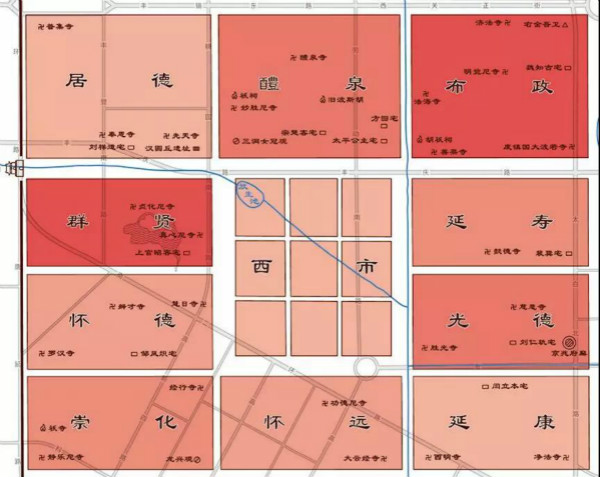 ▲ 西市模型圖,今天的大唐西市大概包含了這個(gè)九宮格的中間格和東北的一部分