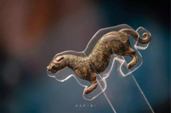 杜虎符為左半符,虎作行走狀,昂首,尾巴蜷曲。背面有槽,頸上有一小孔?;⒎嫌绣e(cuò)金小篆銘文9行共40字。