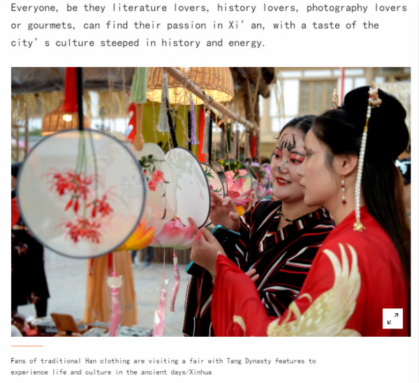 文章中提到:無論是文學愛好者、歷史愛好者,還是美食家,攝影愛好者,都能在西安找到歸屬,品味到這個歷史極致厚重、未來無限可能的城市的文化和內涵。