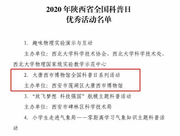 在陜西省科學(xué)技術(shù)協(xié)會的文件中被通報表揚(yáng),博物館全國科普日系列活動上榜“2020陜西省全國科普日優(yōu)秀活動名單”。