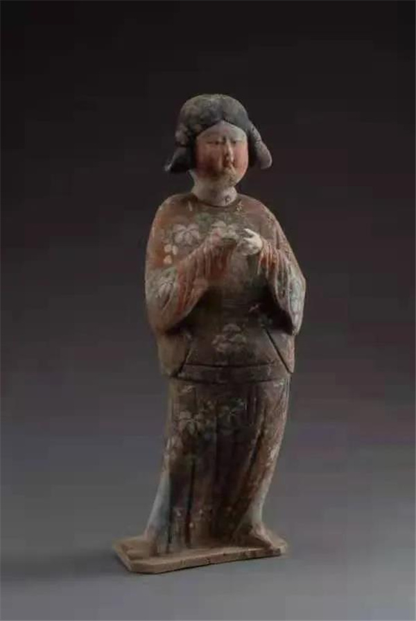 女俑1頭梳高云髻,面龐豐滿,長眉細眼,朱面紅唇,額頭花鈿,神態(tài)怡然;身著圓領灰白色窄袖缺骻袍,上有黑、青、紅色彩繪花朵裝飾,腰帶系于髖部,下穿橙色、黑色相間長裙,裙服彩繪白色小花裝飾,腳穿白色尖頭鞋。俑直立于多邊形踏板上,身體前傾,右手攏袖抬于胸前,右手置于髖部。