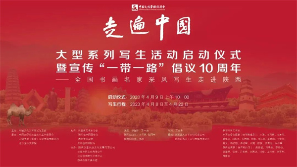 2023年4月9日上午,由中國(guó)文化藝術(shù)發(fā)展促進(jìn)會(huì)主辦的《走遍中國(guó)》大型系列寫(xiě)生活動(dòng)啟動(dòng)儀式暨宣傳“一帶一路”倡議10周年——全國(guó)書(shū)畫(huà)名家采風(fēng)寫(xiě)生走進(jìn)陜西的活動(dòng)在隋唐絲路起點(diǎn)西安大唐西市博物館正式啟動(dòng)。