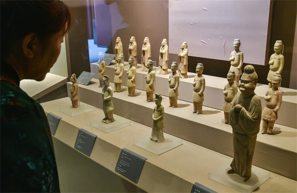 游客參觀大唐西市博物館展出的唐代胡服彩繪陶俑。