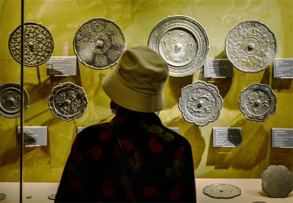 游客參觀大唐西市博物館展出的中國古代銅鏡