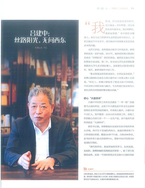 日前,由人民日報社主管主辦的《環(huán)球人物》雜志刊發(fā)文章《呂建中:絲路陽光,無問西東》,講述大唐西市集團董事局主席呂建中與他的絲路故事。
