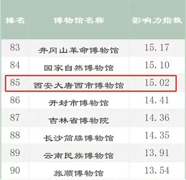 2023年11月13日,《2022年度全國博物館(展覽)海外影響力評估報告》在“2023年全國革命文物展示聯盟年會”上正式對外發(fā)布。西安大唐西市博物館入圍百強。這是大唐西市博物館繼先前入圍中國博物館熱搜榜百強榜單、陜西熱搜博物館榜單十強后,首次入圍海外影響力百強榜單。也是西安入選綜合影響力前100名榜單的6座博物館之一。