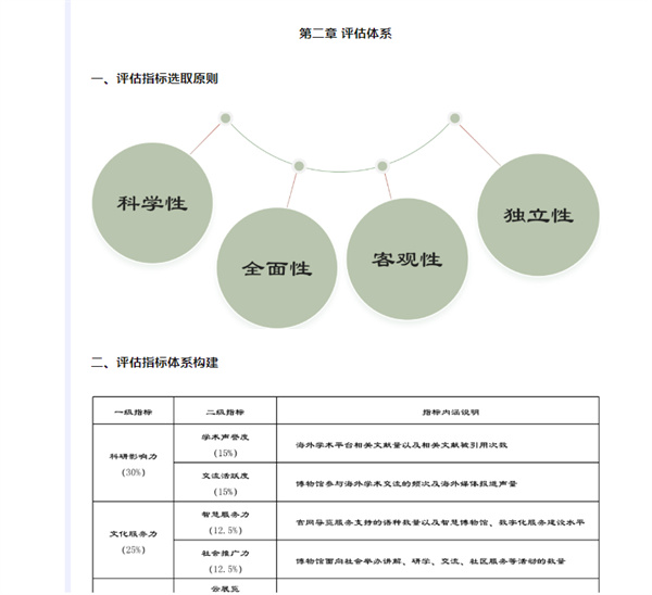 中國文物交流中心聯合文物交流智庫、瞭望東方周刊、中科智庫研究院等文博智庫類研究機構自2019年以來連續(xù)推出《全國博物館(展覽)海外影響力評估報告》,瀏覽量數突破千萬次?!?022年度全國博物館(展覽)海外影響力評估報告》是在總結前三年實踐經驗基礎上,選取不同指標對國家一級博物館進行評估分析。報告以2022年全國一級博物館樣本數據和海外輿情數據為基礎,統(tǒng)計整理2022年全國博物館在科研影響力、文化服務力、展覽創(chuàng)新力、媒體傳播力等方面的表現。