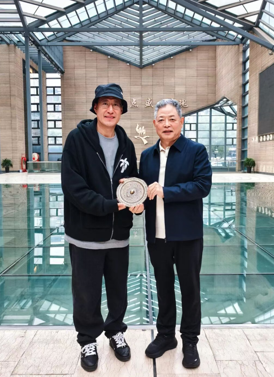 呂建中主席向于震介紹以館藏“人民昌·中國(guó)強(qiáng)”漢代銅鏡為原型復(fù)仿制作的文創(chuàng)藝術(shù)品,介紹其中蘊(yùn)含的深厚家國(guó)情懷、古今共通的情感和一脈相承的強(qiáng)國(guó)理念時(shí),于震感慨地連連稱贊。
